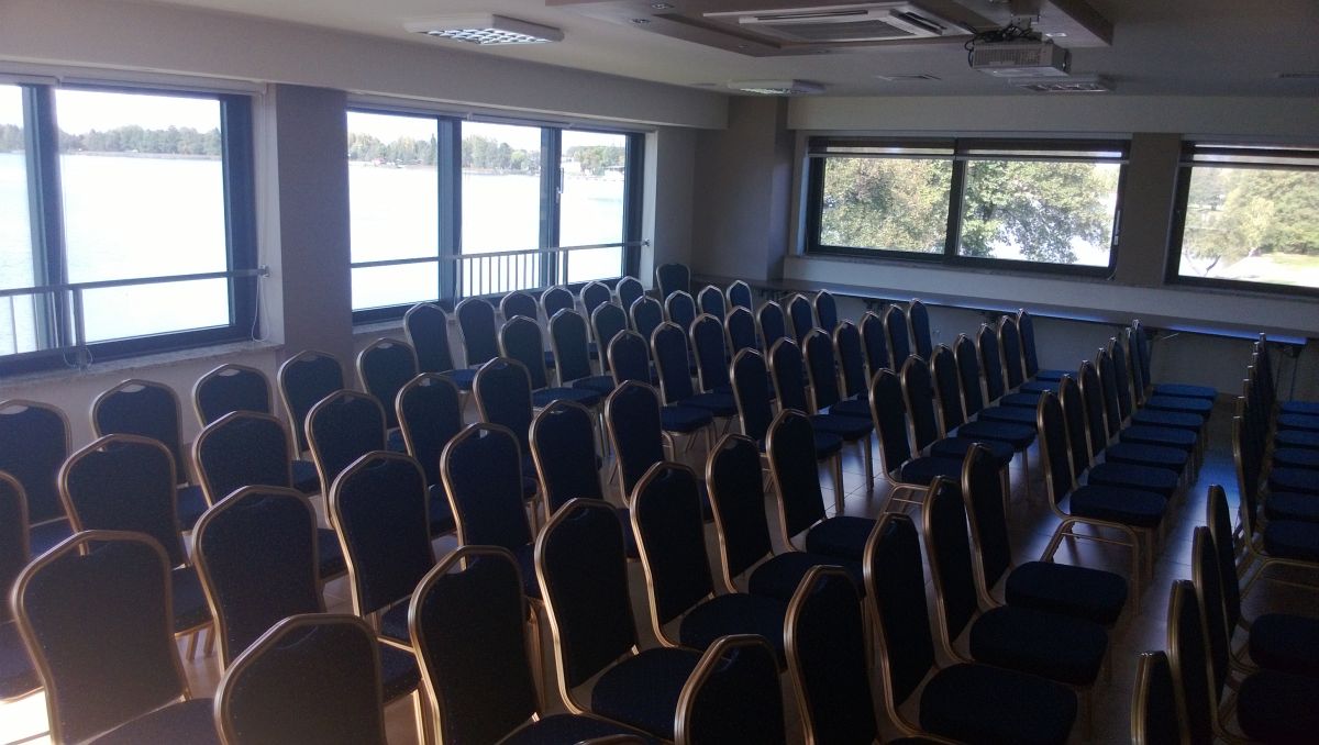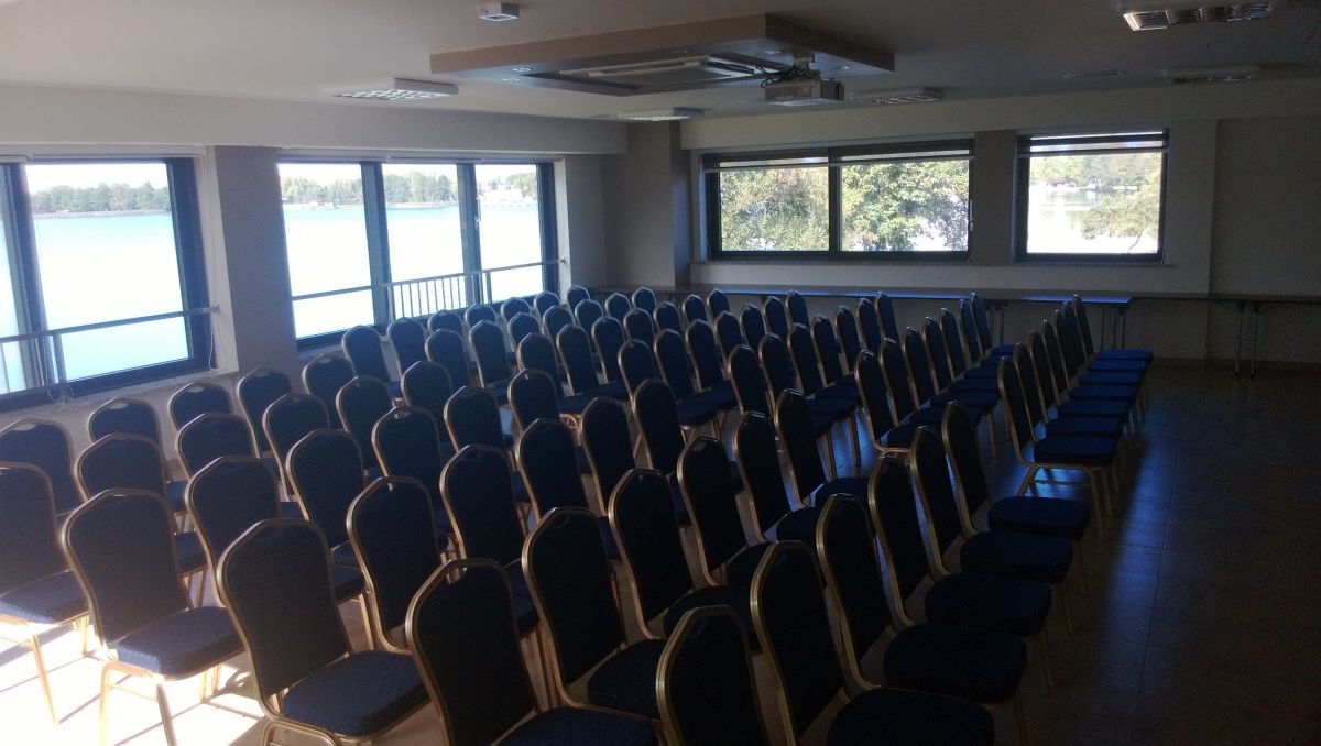 Sala kominkowa z bezpośrednim widokiem na jezioro w układzie kinowym może pomieścić 125 osób, a w układzie konferencyjnym z powodzeniem ponad 80 osób. Obie sale są widne, przestronne, klimatyzowane z możliwością zaciemnienia podczas prezentacji.